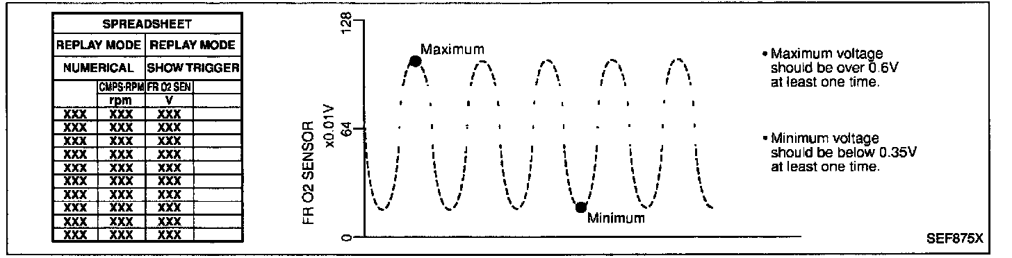 - "FR O2 SENSOR" voltage goes below 0.35V at least once.
