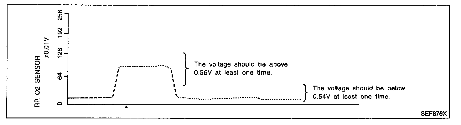 "RR O2 SENSOR" should be above 0.56V at least once when the "FUEL INJECTION" is +25%.