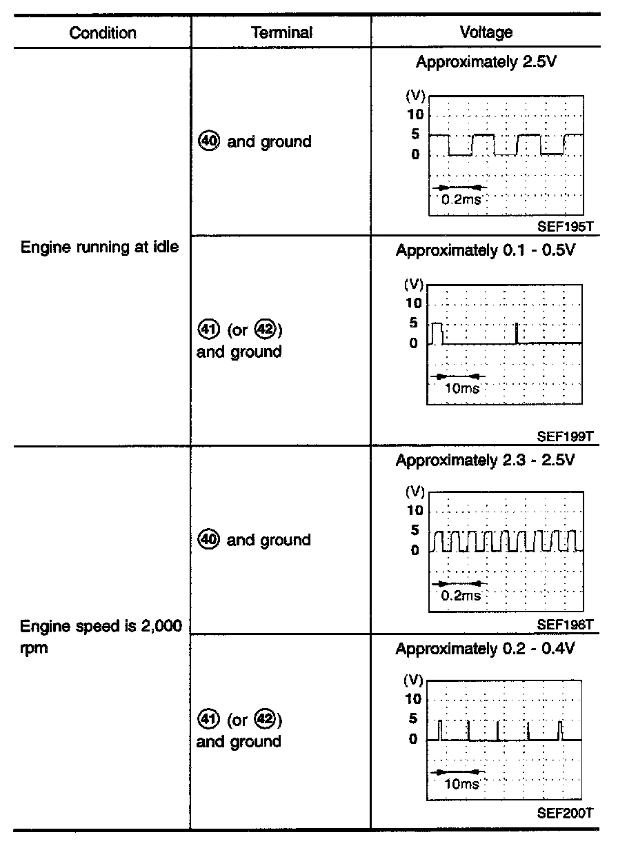 2. Check voltage between ECM terminals (41) or (42), (40) and ground.