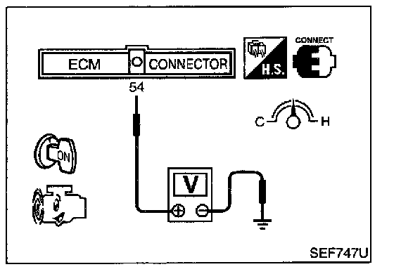 3. Check voltage between ECM terminal 54 (Mass air flow sensor signal) and ground.