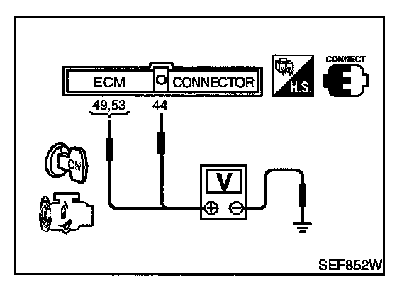 3. Check voltage between ECM terminals 49, 53 and ground, ECM terminal 44 and ground with DC range.