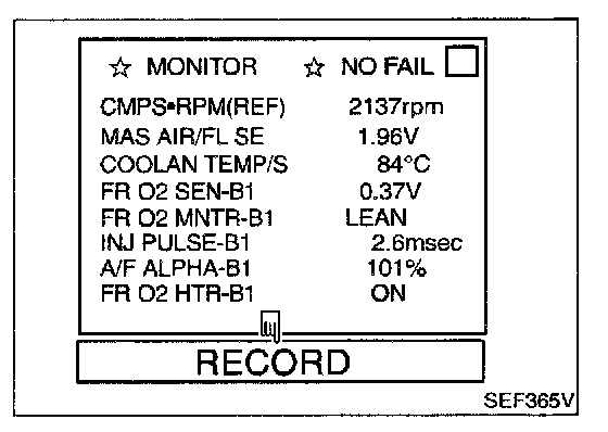 - "FR O2 MNTR-B1 (-B2)" in "DATA MONITOR" mode changes from "RICH" to "LEAN" to "RICH" 5 times in 10 seconds. 5 times (cycles) are counted as shown left: