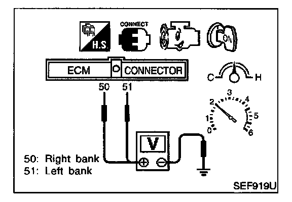 2. Set voltmeter probes between ECM terminal 50 (right bank sensor signal) or 51 (left bank sensor signal) and engine ground.