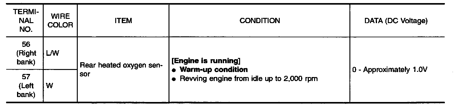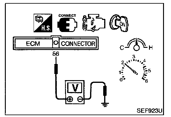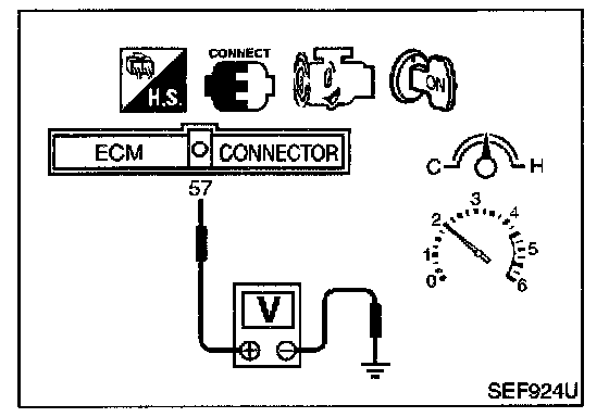 3. Set voltmeter probes between ECM terminal 56 (right bank sensor signal) or 57 (left bank sensor signal) engine ground.