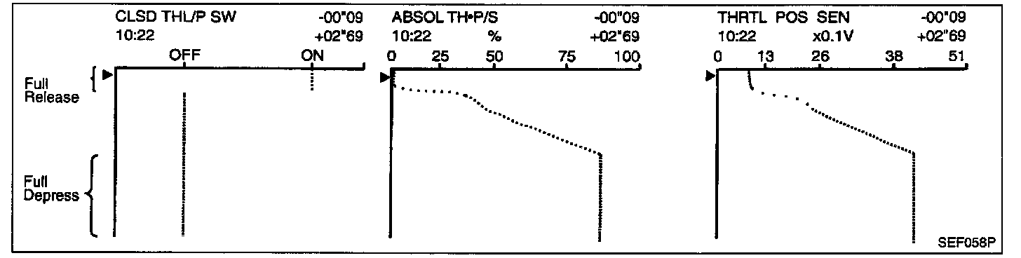 Below is the data for "THRTL POS SEN", "ABSOL TH.P/S" and "CLSD THL/P SW" when depressing the accelerator pedal with the ignition switch "ON".