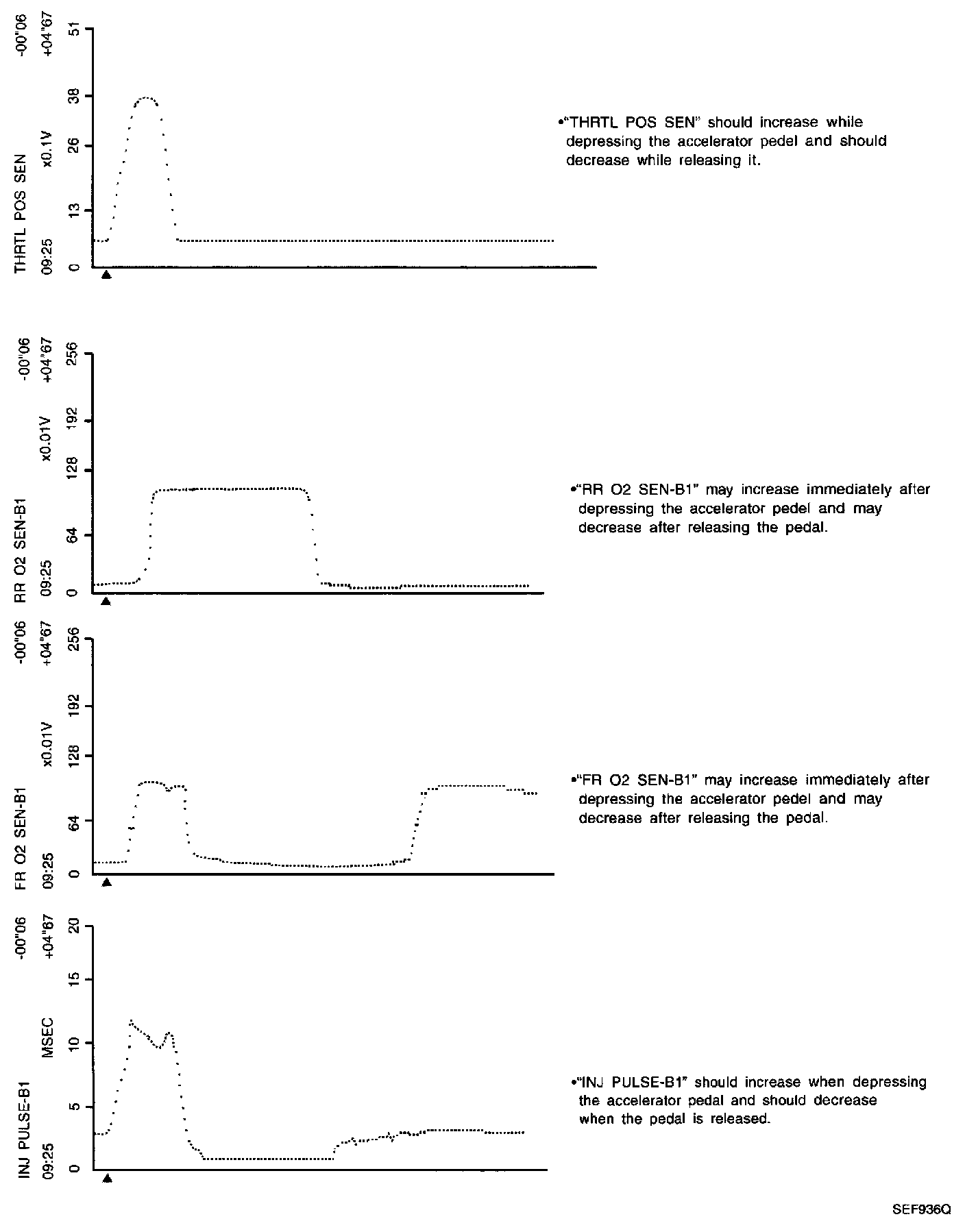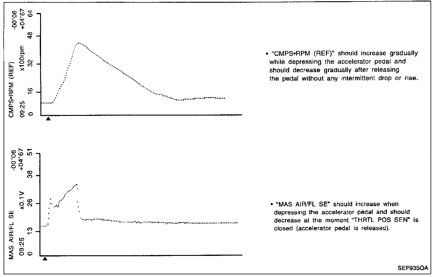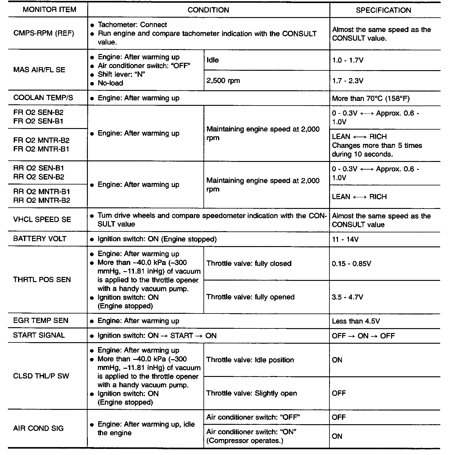 The following are the major sensor reference graphs in "DATA MONITOR" mode. (Select "HI SPEED" in "DATA MONITOR" with CONSULT.)