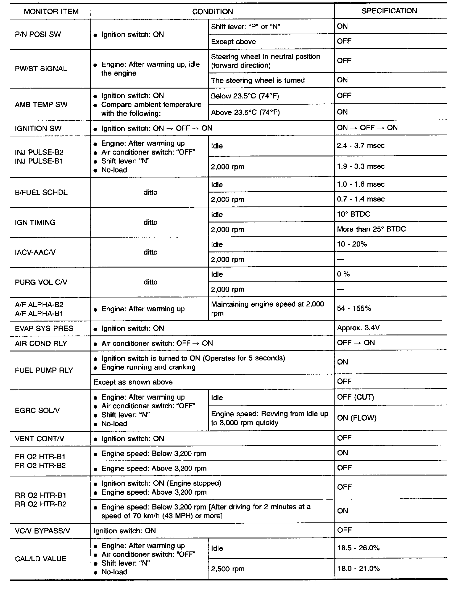 i.e. Adjust ignition timing with a timing light before monitoring IGN TIMING, because the monitor may show the specification data in spite of the ignition timing not being adjusted to the specification data. This IGN TIMING monitors the data calculated by the ECM according to the signals input from the camshaft position sensor and other ignition timing related sensors.