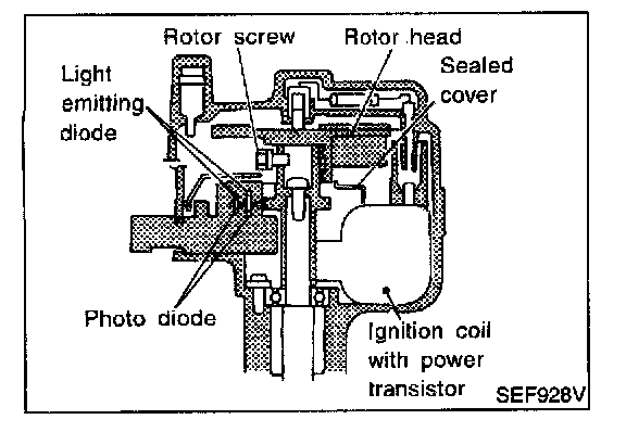 The power transistor switches on and off the ignition coil primary circuit according to the ECM signal. As the primary circuit is turned on and off, the proper high voltage is induced in the secondary circuit. The distributor is not repairable except for the distributor cap and rotor head.