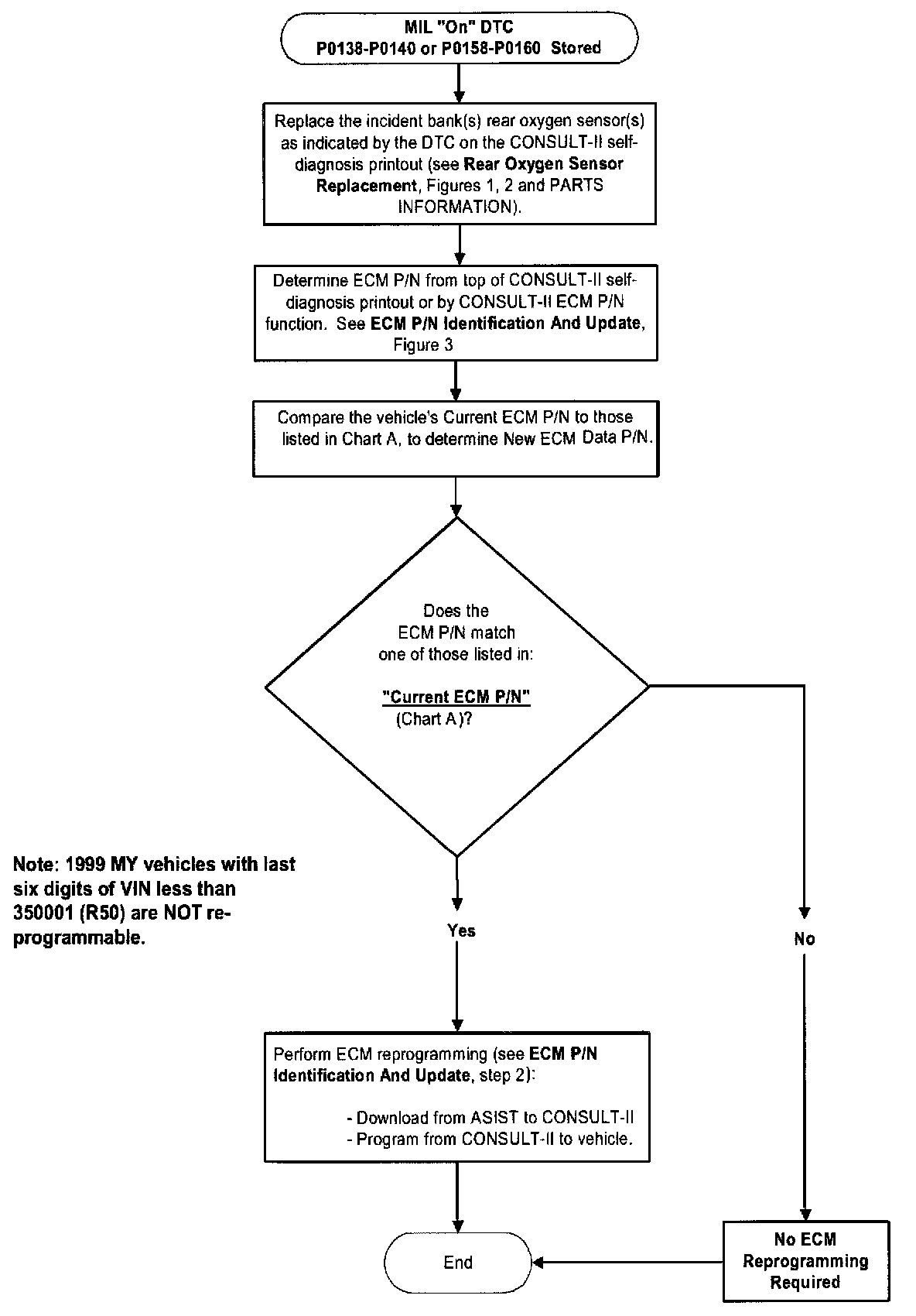 ^ If the ECM P/N in the vehicle does not match one of those listed under "Current ECM Data P/N" in Chart A (above) do not perform ECM reprogramming. The procedure is complete if the incident bank(s) 02 sensor(s) were replaced as part of this bulletin.