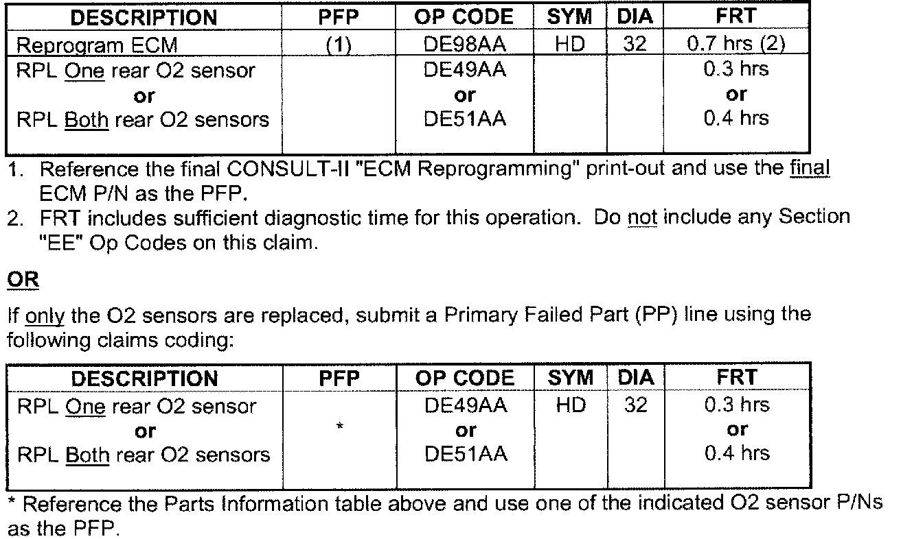 If both the ECM is reprogrammed and the 02 sensor(s) are replaced, submit a Primary Failed Part (PP) line claim using the claims coding as shown.