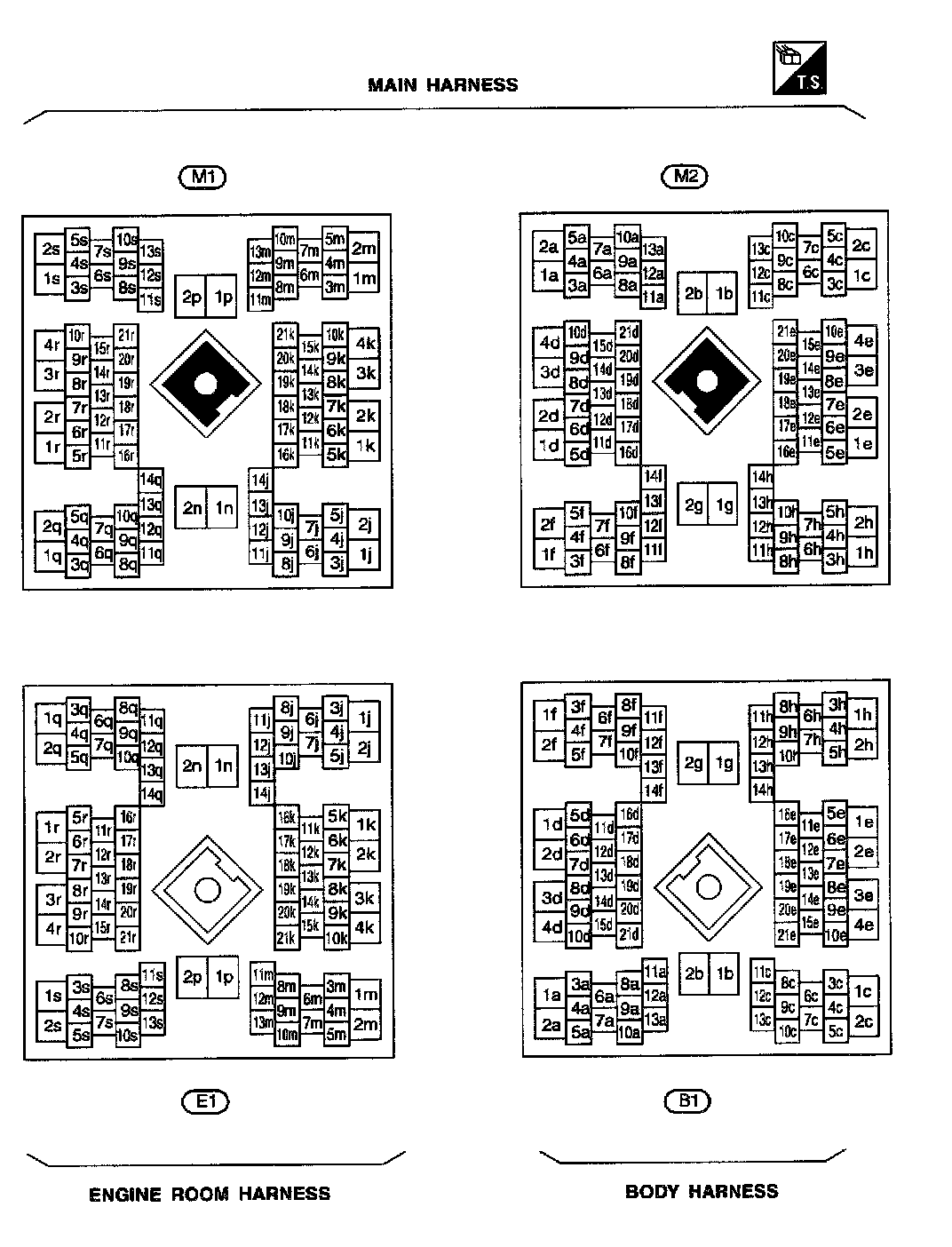 Main Harness, Engine Room, And Body Harness Connector Views: