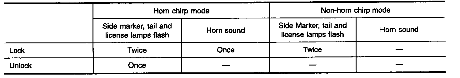 When LOCK and UNLOCK signals are sent from the remote controller for more than 2 seconds at the same time, the door lock verification mode is changed and hazard warning lamp flashes and horn sounds as follows: