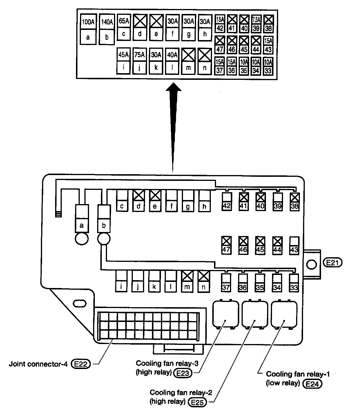 E22 Fuse and Fusible Link Box Terminal Arrangement