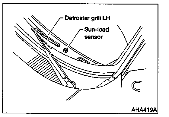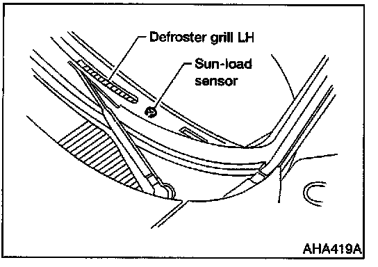 The sunload sensor is located on the left defroster grille. It detects sunload entering through the windshield by means of a photo diode and converts it into a current value which is then input to the EATC unit.