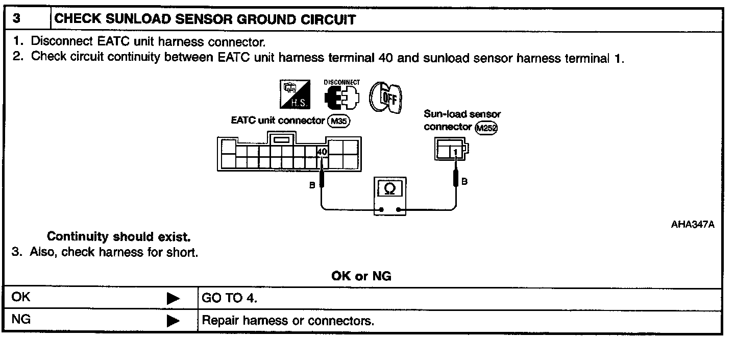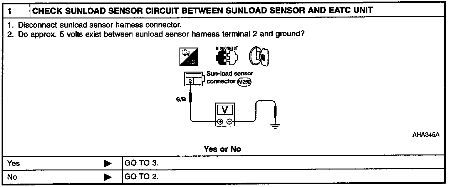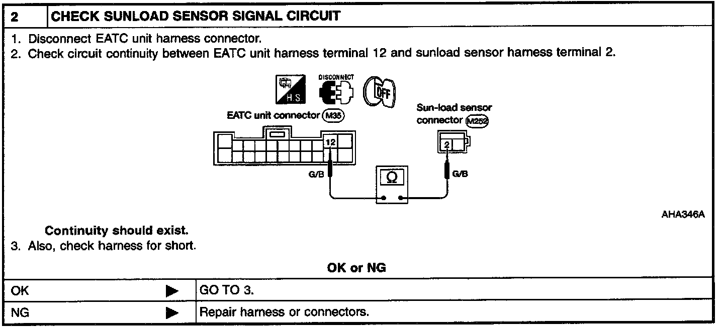 After disconnecting sunload sensor harness connector, measure resistance between sensor terminals 1 and 2. The resistance should be greater than 0 ohms depending on the amount of sunlight.