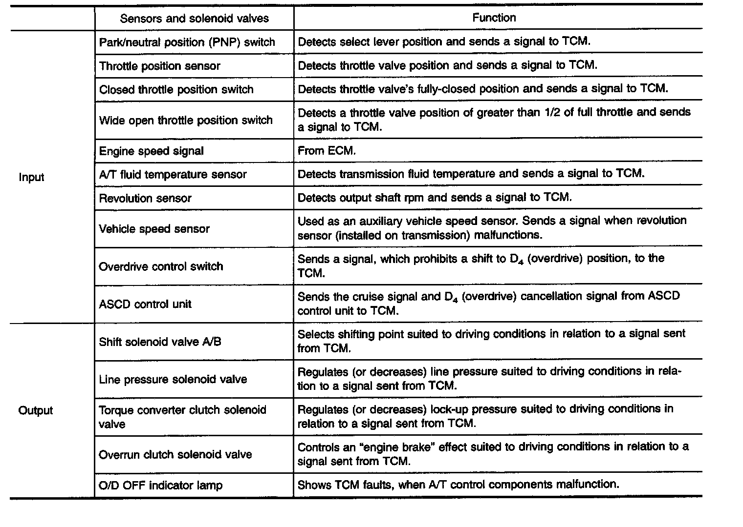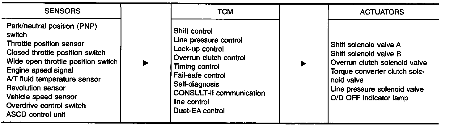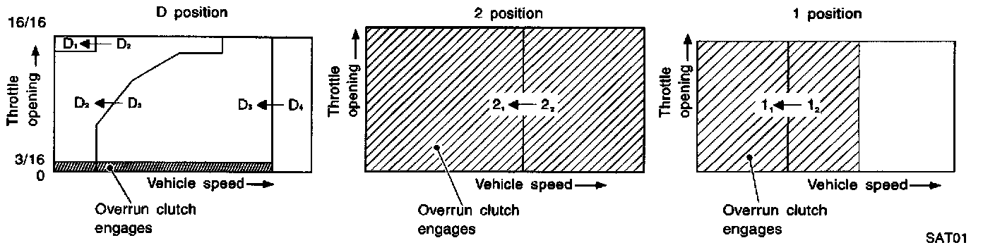 The TCM activates shift solenoid valves A and B according to signals from the throttle position sensor and revolution sensor to select the optimum gear position on the basis of the shift schedule memorized in the TCM.