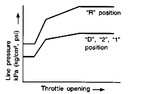 - Line pressure is increased to a maximum irrespective of the throttle opening when fluid temperature drops to -10°C (14°F). This pressure rise is adopted to prevent a delay in clutch and brake operation due to extreme drop of fluid viscosity at low temperature.