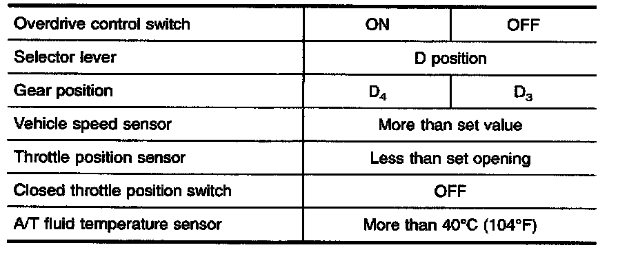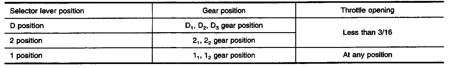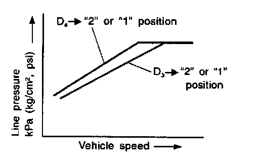If the selector lever is shifted to 2 position while driving in D4 (O/D) or D3, great driving force is applied to the clutch inside the transmission. Clutch operating pressure (line pressure) must be increased to deal with this driving force.