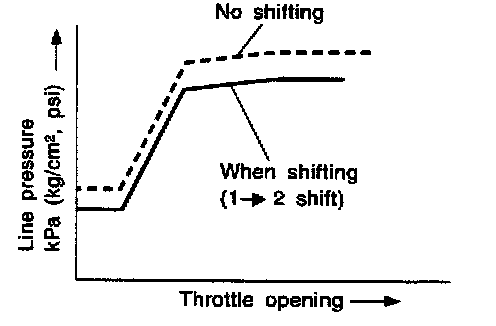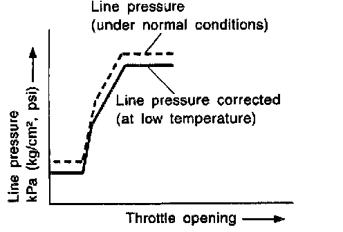 - The line pressure is reduced below 60°C (140°F) to prevent shifting shock due to low viscosity of automatic transmission fluid when temperature is low.