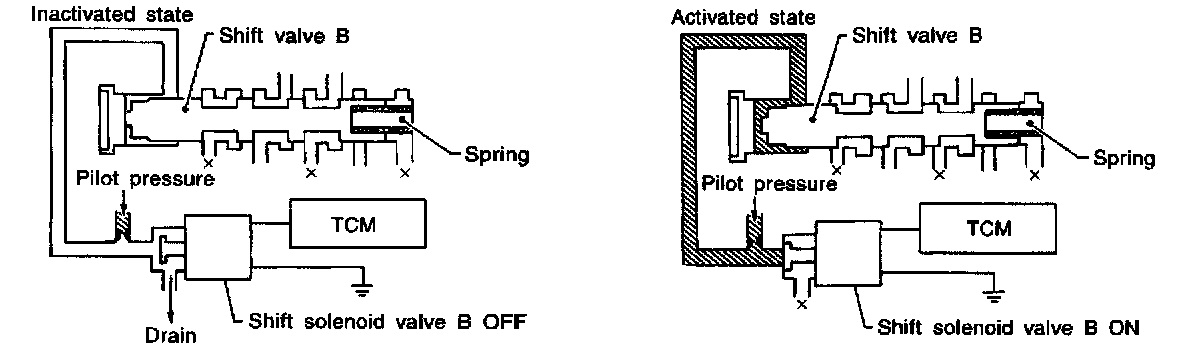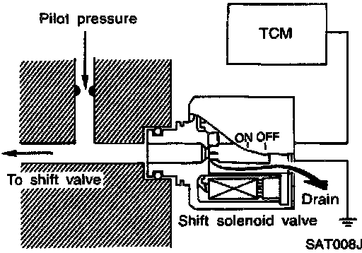 The shift solenoid valve performs simple ON-OFF operation. When set to ON, the drain circuit closes and pilot pressure is applied to the shift valve.