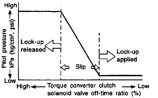 The torque converter clutch solenoid valve is controlled by the TCM. The plunger closes the drain circuit during the OFF period, and opens the circuit during the ON period. If the percentage of OFF-time increases in one cycle, the pilot pressure drain time is reduced and pilot pressure remains high.