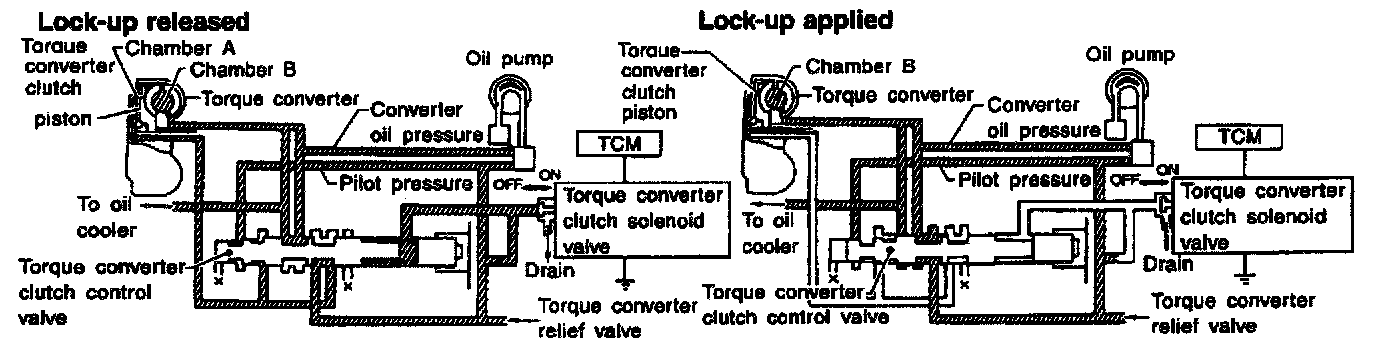 The torque converter clutch piston in the torque converter is locked to eliminate torque converter slip to increase power transmission efficiency. The solenoid valve is controlled by an ON-OFF duty signal sent from the TCM. The signal is converted to an oil pressure signal which controls the lock-up piston.