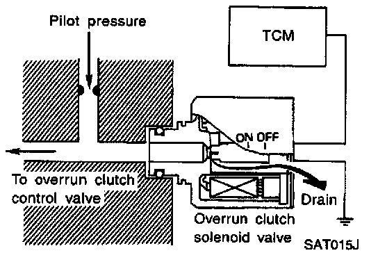 The overrun clutch solenoid valve is operated by an ON-OFF signal transmitted by the TCM to provide overrun clutch control (engine brake control).