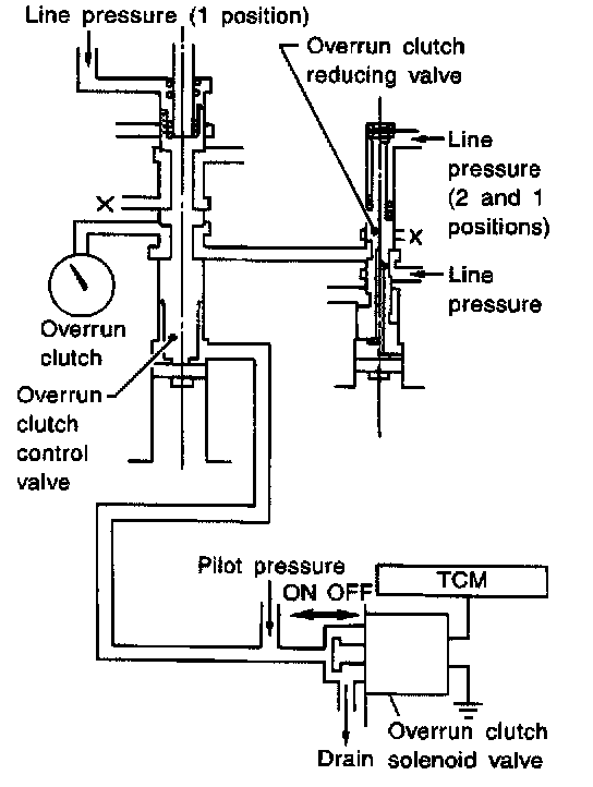 During the solenoid valve ON pilot pressure is applied to the end face of the overrun clutch control valve.