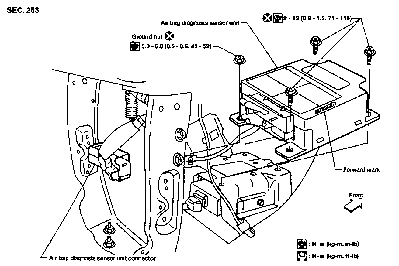 CAUTION: Air bag diagnosis sensor unit must always be installed with forward mark "<=" pointing toward the front of the vehicle for proper operation. Also check air bag diagnosis sensor unit for cracks, deformities and rust before installation and replace as required.