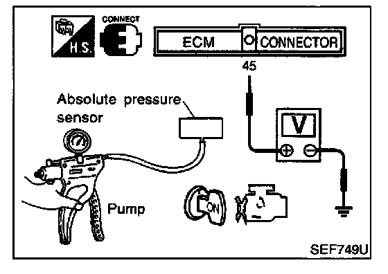 3. Turn ignition switch "ON" and check output voltage between ECM terminal 45 and engine ground.