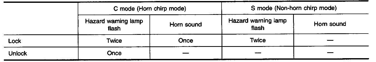 When LOCK and UNLOCK signals are sent from the remote controller for more than 2 seconds at the same time, the hazard and horn reminder mode is changed and hazard warning lamp flashes and horn sounds as follows: