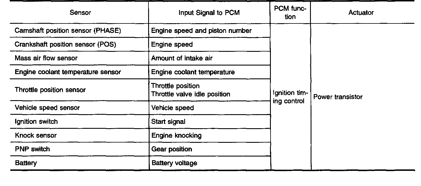The ignition timing is controlled by the PCM to maintain the best air-fuel ratio for every running condition of the engine. The ignition timing data is stored in the PCM. This data forms the map shown above. The PCM receives information such as the injection pulse width and camshaft position sensor (PHASE) signal. Computing this information, ignition signals are transmitted to the power transistor.