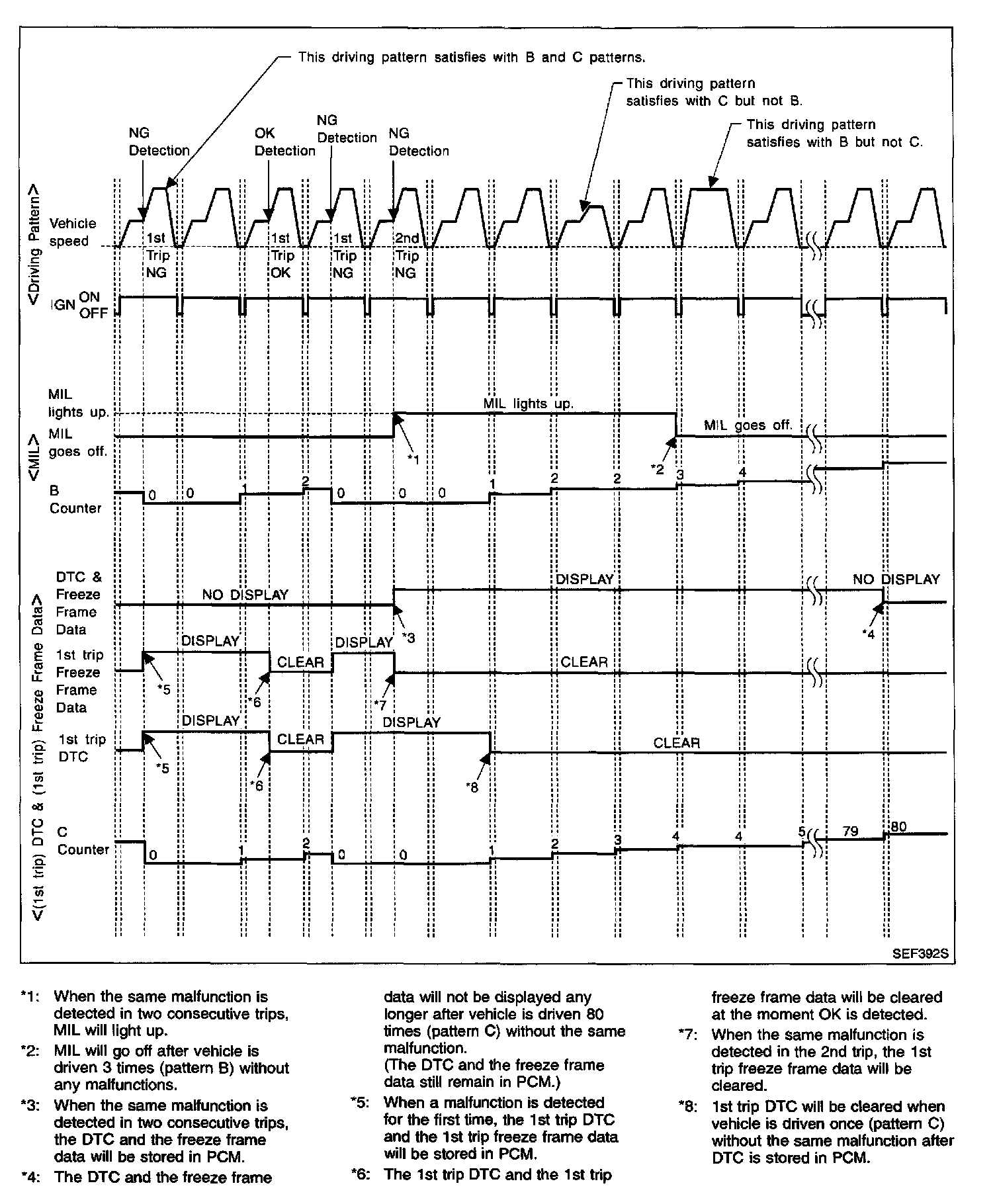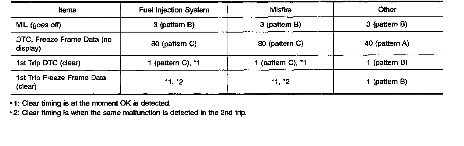 - The DTC and the freeze frame data will be stored until the vehicle is driven 40 times (driving pattern A) without the same malfunction recurring (except for Misfire and Fuel Injection System). For Misfire and Fuel Injection System, the DTC and freeze frame data will be stored until the vehicle is driven 80 times (driving pattern C) without the same malfunction recurring. The "TIME" in "SELF-DIAGNOSTIC RESULTS" mode of CONSULT-II will count the number of times the vehicle is driven.