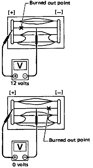 2. If a filament is burned out, circuit tester registers 0 or 12 volts.