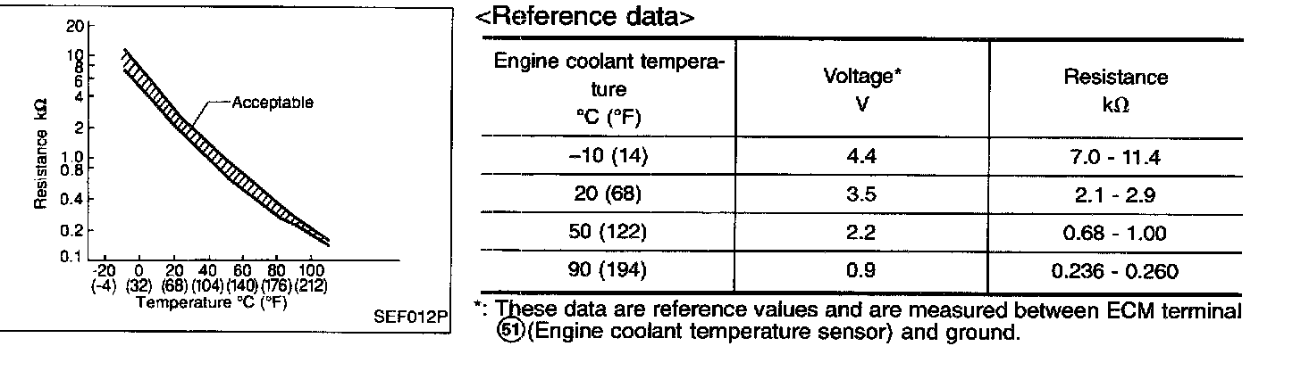 The engine coolant temperature sensor is used to detect the engine coolant temperature. The sensor modifies a voltage signal from the ECM. The modified signal returns to the ECM as the engine coolant temperature input. The sensor uses a thermistor which is sensitive to the change in temperature. The electrical resistance of the thermistor decreases as temperature increases.