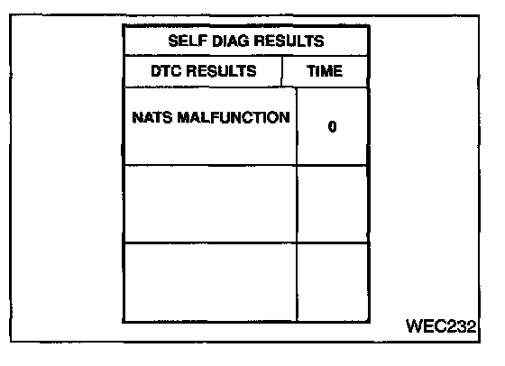 - If the security indicator lights up with ignition switch in the "ON" position or "NATS MALFUNCTION" is displayed on "SELF-DIAG RESULTS" screen, perform self-diagnostic results mode with CONSULT-II using NATS program card. Refer to "NVIS (Nissan Vehicle Immobilizer System - NATS)".