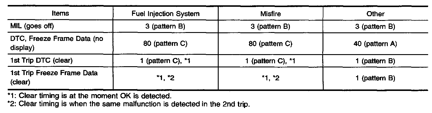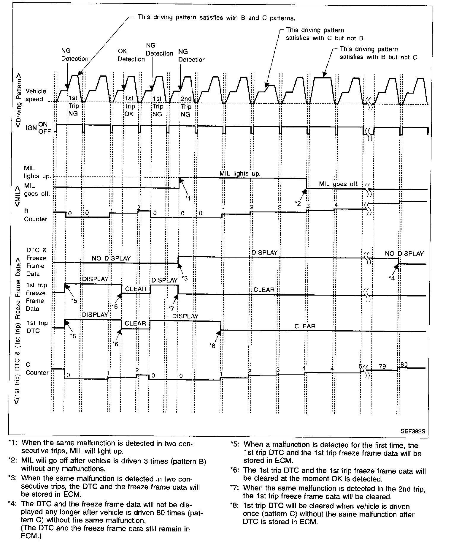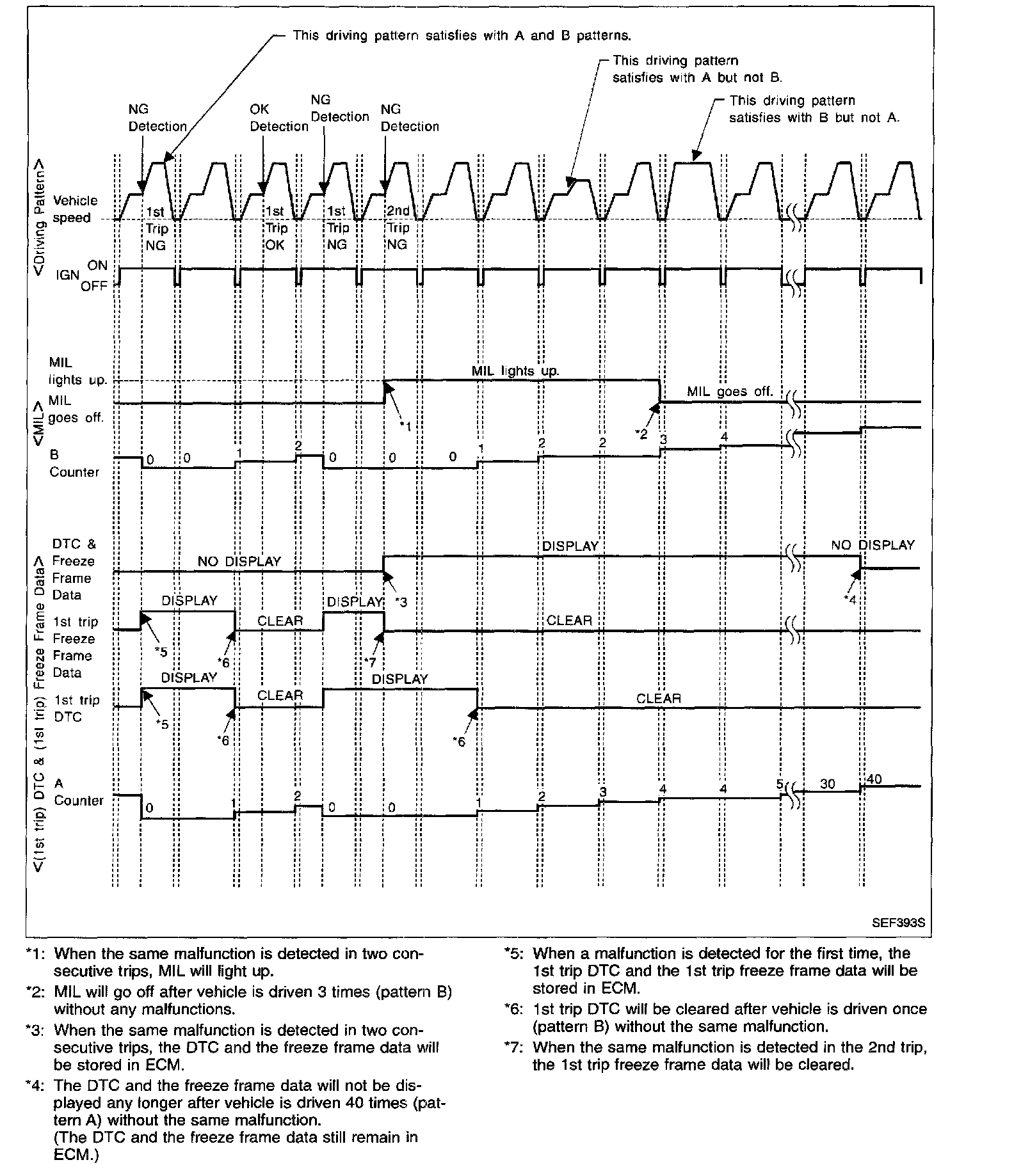 - The DTC and the freeze frame data will be stored until the vehicle is driven 40 times (driving pattern A) without the same malfunction recurring (except for Misfire and Fuel Injection System). For Misfire and Fuel Injection System, the DTC and freeze frame data will be stored until the vehicle is driven 80 times (driving pattern C) without the same malfunction recurring. The "TIME" in "SELF-DIAGNOSTIC RESULTS" mode of CONSULT-II will count the number of times the vehicle is driven.