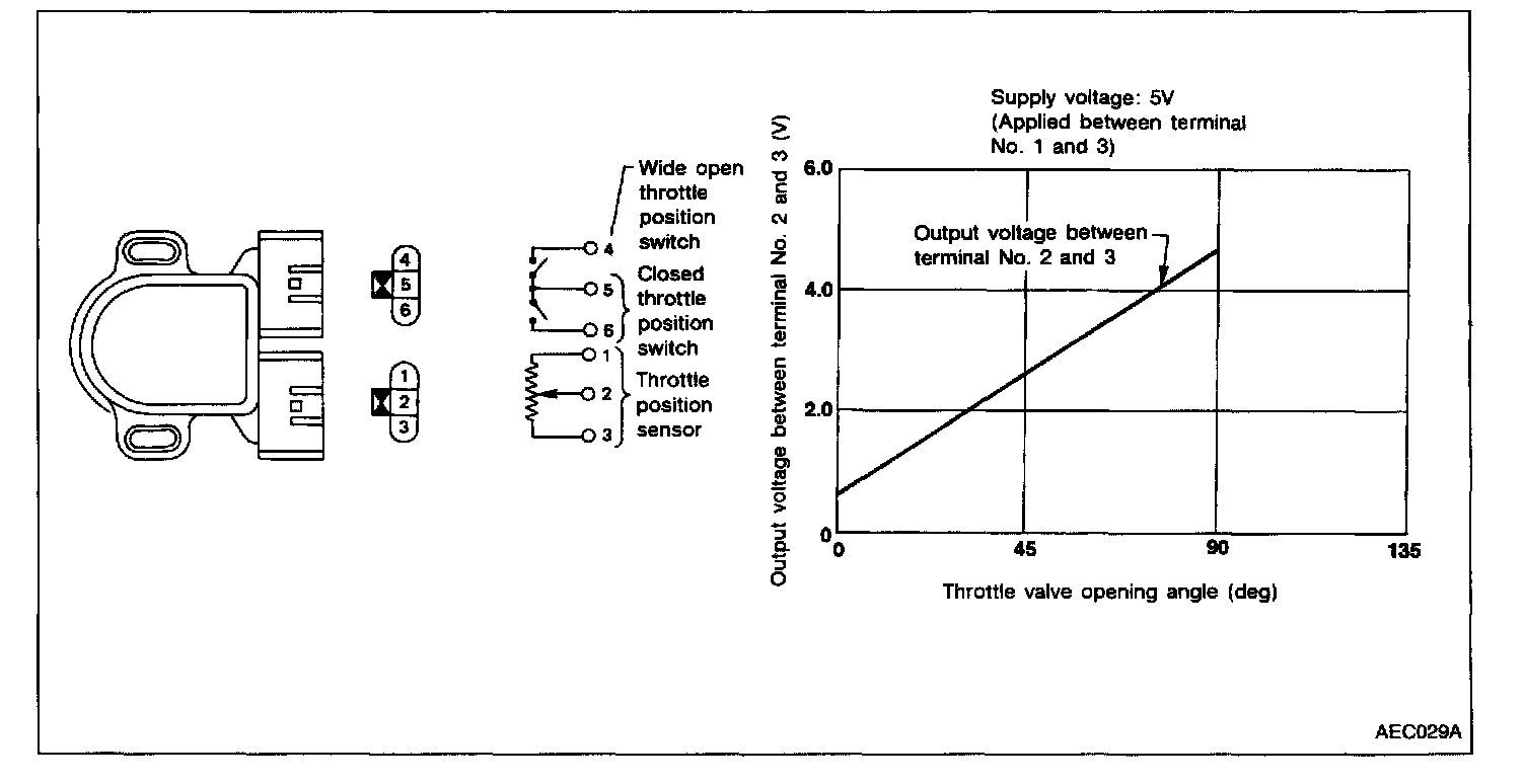 NOTE: If both DTC P0120 and DTC P0510 are displayed, perform TROUBLE DIAGNOSIS FOR DTC P0510 first.The throttle position sensor responds to the accelerator pedal movement. This sensor is a kind of potentiometer which transforms the throttle position into output voltage, and emits the voltage signal to the ECM. In addition, the sensor detects the opening and closing speed of the throttle valve and feeds the voltage signal to the ECM.