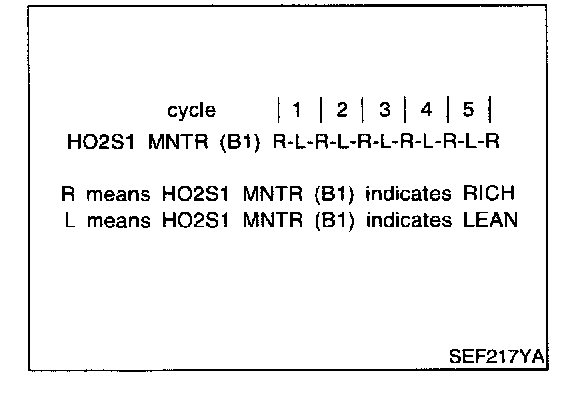- "HO2S1 MNTR (B1)" in "DATA MONITOR" mode changes from "RICH" to "LEAN" to "RICH" 5 times in 10 seconds.