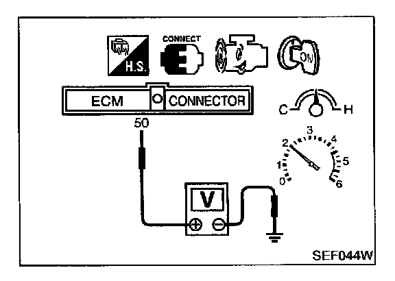 2. Set voltmeter probes between ECM terminal 50 [Heated oxygen sensor 1 (front) signal] and engine ground.