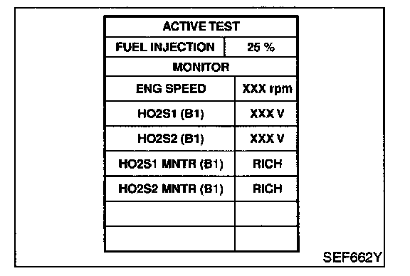 3. Select "FUEL INJECTION" in "ACTIVE TEST" mode, and select "HO2S2 (B1)" as the monitor item with CONSULT-II.