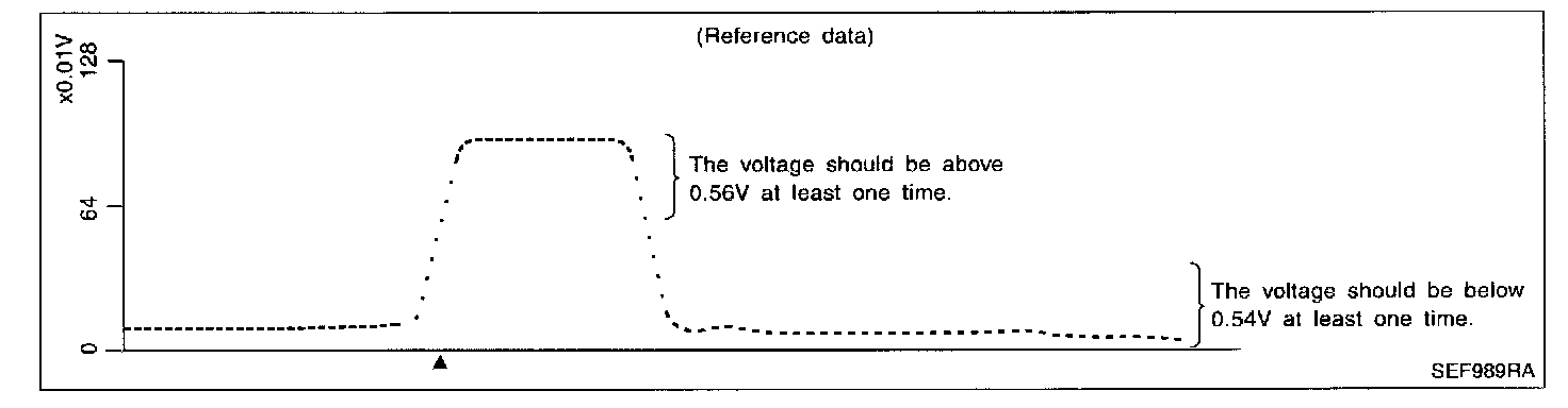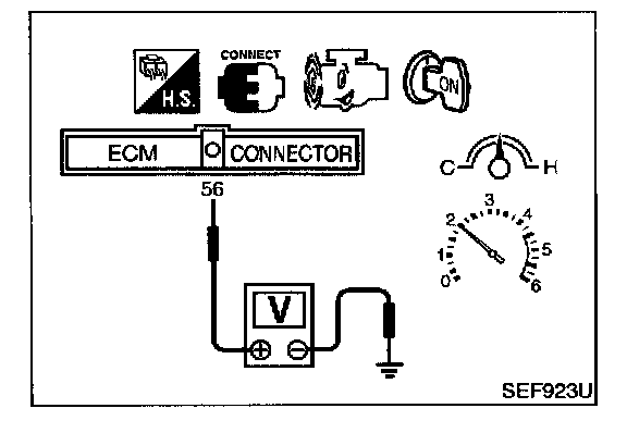3. Set voltmeter probes between ECM terminal 56 [Heated oxygen sensor 2 (rear) signal] engine ground.