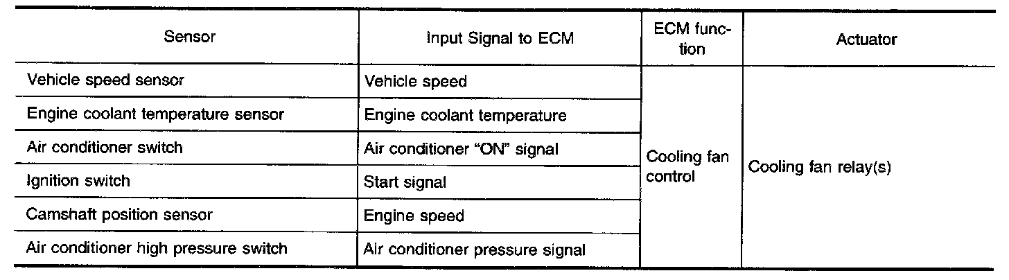 System DescriptionCOOLING FAN CONTROLThe ECM controls the cooling fan corresponding to the vehicle speed, engine coolant temperature, air conditioner high pressure signal, and air conditioner