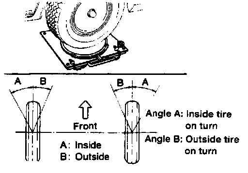 1. Set wheels in straight-ahead position. Then move vehicle forward until front wheels rest on turning radius gauge properly.