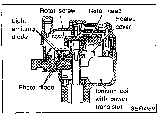 The power transistor switches on and off the ignition coil primary circuit according to the ECM signal. As the primary circuit is turned on and off, the proper high voltage is induced in the secondary circuit. The distributor is not repairable except for the distributor cap and rotor head.