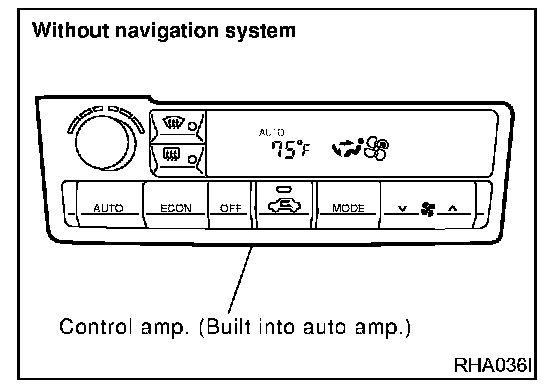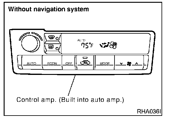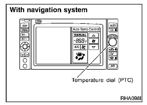 The PTC is built into the A/C auto amp. or Display and NAVI control unit. It can be set at an interval of 0.5 °C (1.0 °F) in the 18 °C (60 °F) to 32 °C (90 °F) temperature range by pushing the temperature button. The set temperature is digitally displayed.