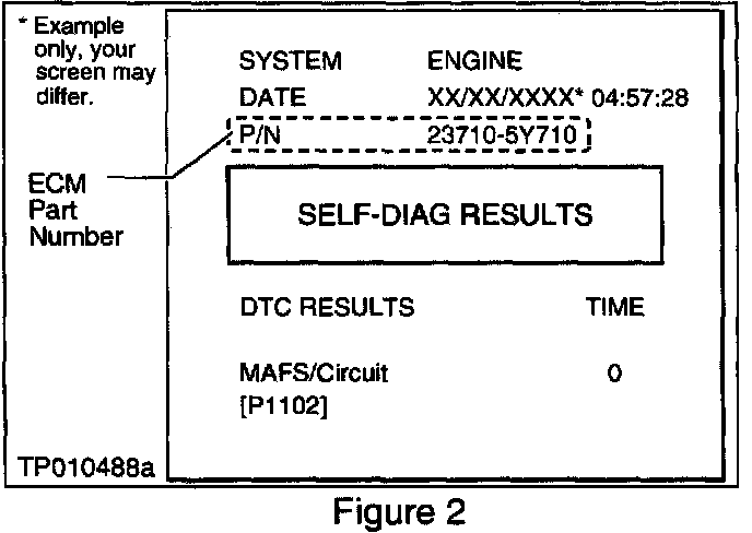 4. Determine the vehicle's ECM Part Number. The ECM P/N is found on top of the CONSULT-II self-diagnosis printout (see Figure 2), or by CONSULT ECM P/N Selection