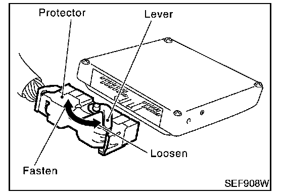 - When connecting ECM harness connector, fasten it securely with a lever as far as it will go as shown.