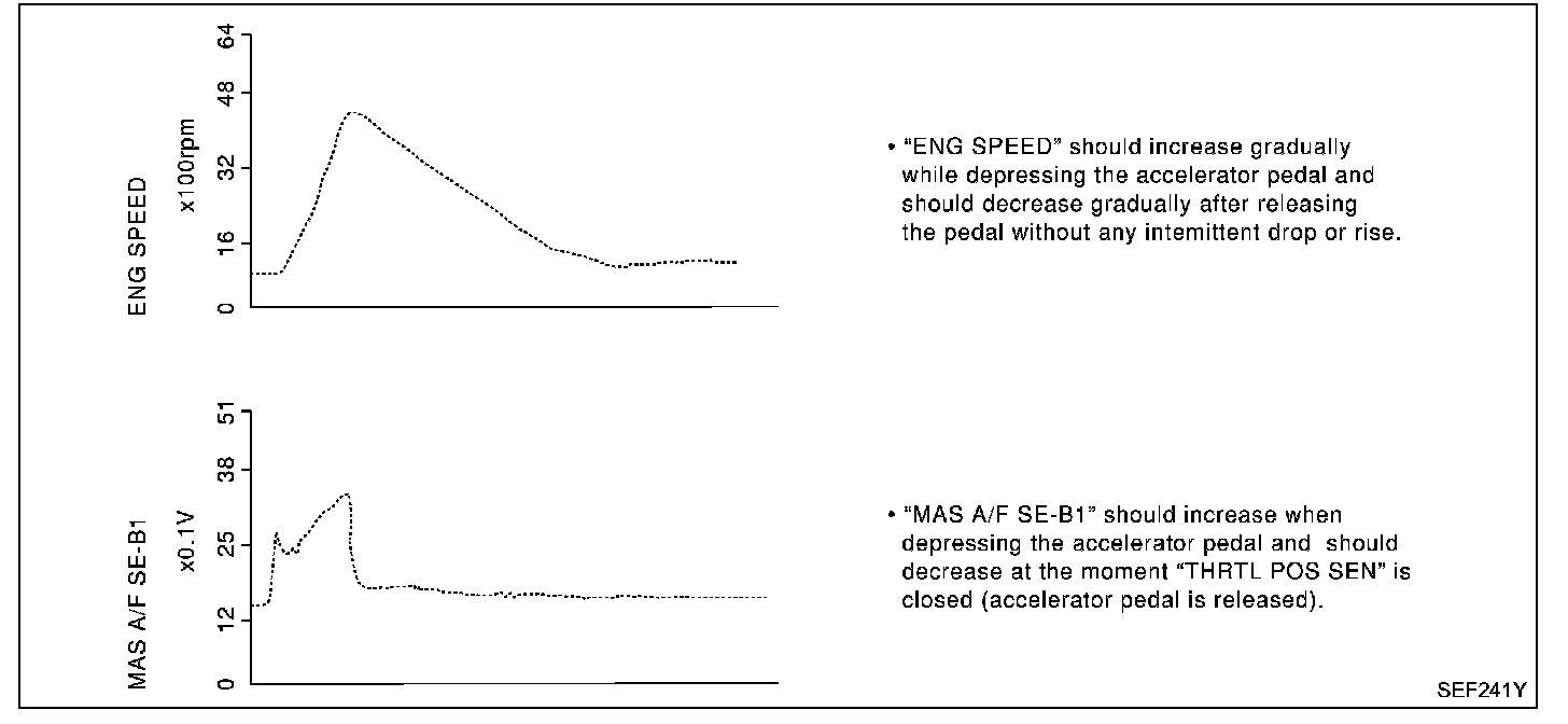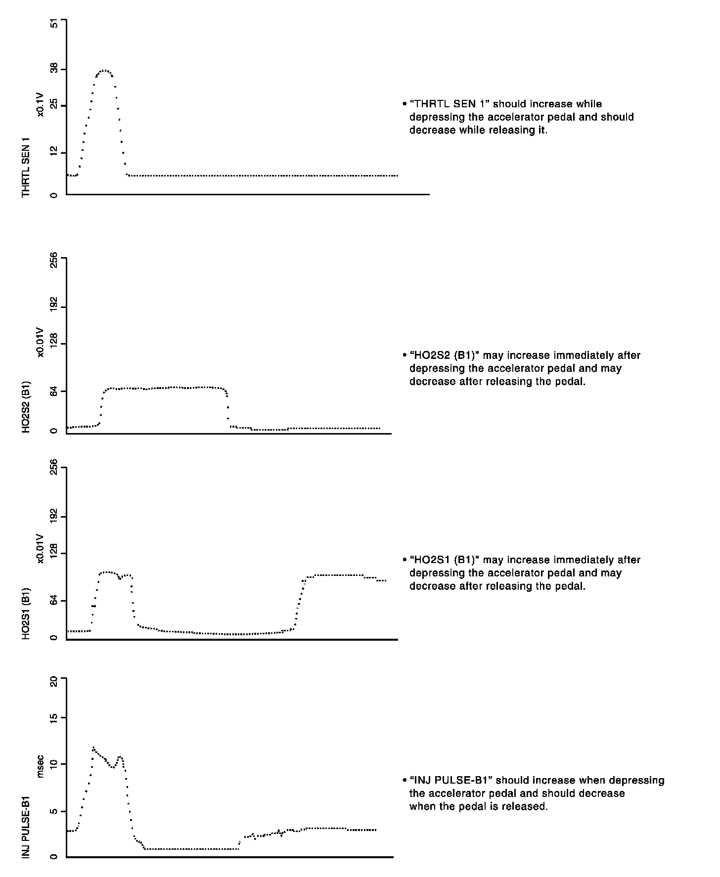 Above is the data for "CLSD THL POS", "ACCEL SEN1" and "THRTL SEN1" when depressing the accelerator pedal with the ignition switch "ON" and with selector lever in "D" position (AT models) or with shift lever in "1st" position (MT models).
