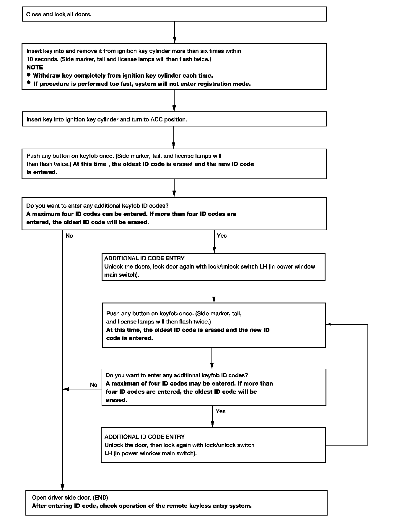 When registering an additional keyfob, the existing ID codes in memory may or may not be erased. If four ID codes are stored in memory, when an additional code is registered, only the oldest code is erased. If less than four ID codes are stored in memory, when an additional ID code is registered the new ID code is added and no ID codes are erased.